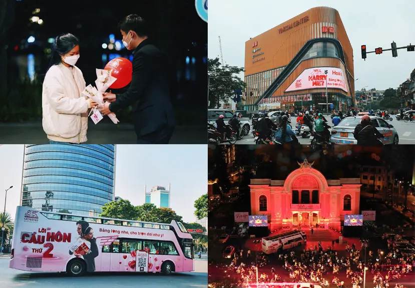 Cũng trong dịp này, Generali đã bất ngờ “cầu hôn” người dân từ Nam ra Bắc qua các hoạt động tặng quà tại phố đi bộ Hồ Gươm (Hà Nội) và phố đi bộ Nguyễn Huệ (TP.HCM). Bên cạnh đó, Generali cũng gửi lời “cầu hôn” qua hàng loạt biển quảng cáo ngoài trời thắp sáng tên của từng khách hàng kèm lời ngỏ “Will you marry me?” tại các địa điểm sầm uất như Tràng Tiền Plaza (Hà Nội), Lý Thái Tổ (TP.HCM), vòng xoay ngã 6 (Đà Nẵng) để lan tỏa thông điệp đến nhiều người nhất có thể.