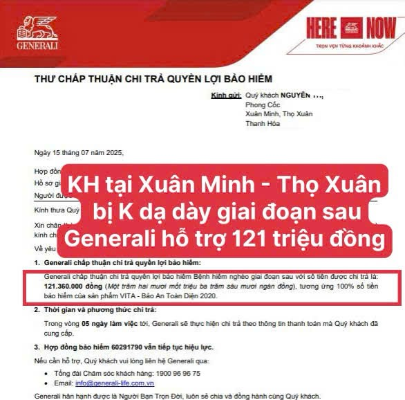 Trong hành trình đồng hành cùng khách hàng, Generali luôn nỗ lực mang đến sự an tâm và niềm tin vững chắc. Mới đây, một khách hàng tại Thanh Hóa đã nhận được quyền lợi bảo hiểm bệnh hiểm nghèo với số tiền chi trả 121 triệu đồng sau khi không may mắc ung thư dạ dày giai đoạn 3.